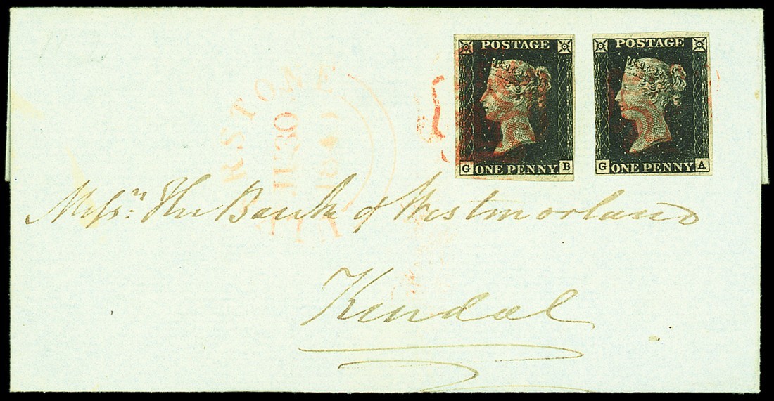 GA and GB, tied by red Maltese Cross cancellations on entire, dated 30 June 1840, addressed to Kendal, GA touched at left, otherwise good to large margins all round, red Ulverstone c.d.s. on the front, attractive. Photo