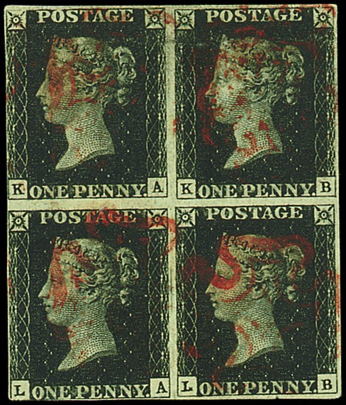KA-LB block of four, LA touched at foot, close at left, good margins other sides, red Maltese Cross cancellations, horizontal crease affecting the upper pair, otherwise fine and attractive. Photo