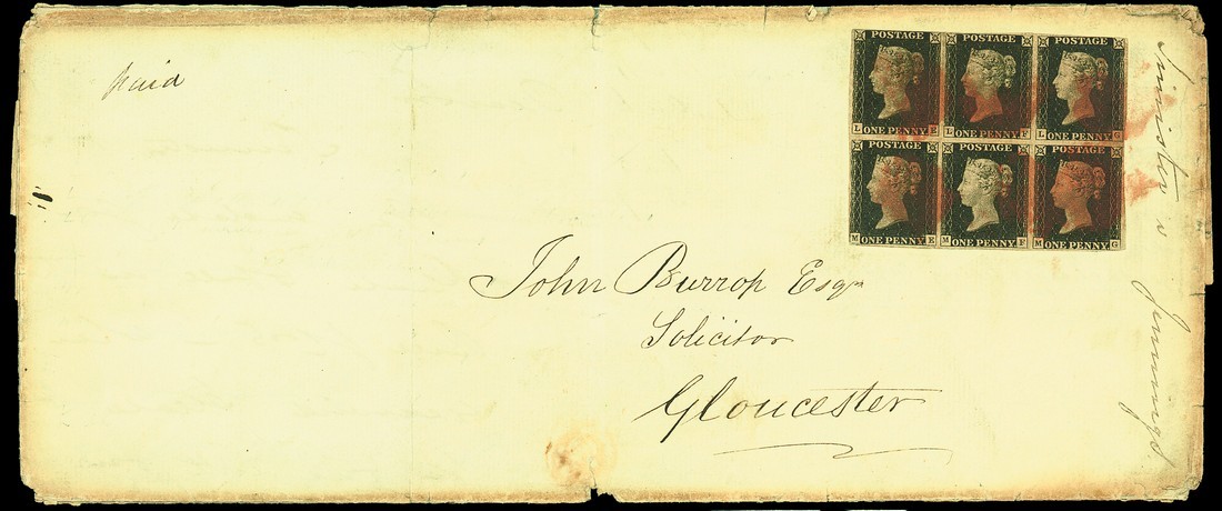 LE-MG (LE constant variety, ME double letter M) block of six (3x2), touched or slightly cut into at places, tied by red Maltese Cross cancellations on long entire letter, dated 7 Dec. 1840, from Birmingham to Gloucester; the entire strengthened along the folds and some faults, nevertheless a rare and impressive multiple. Photo