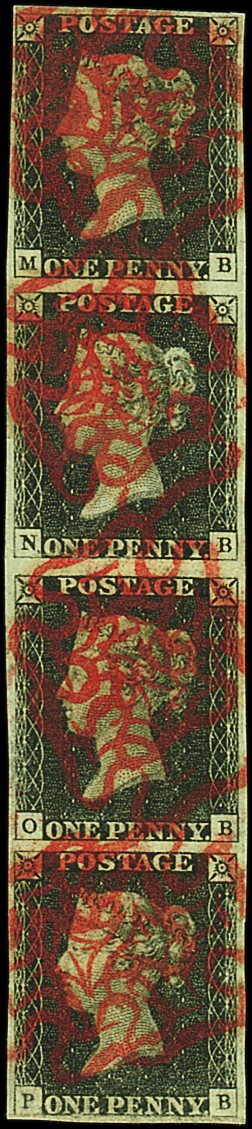 MB-PB (PB recut letter squares) vertical strip of four, good to large margins all round, red Maltese Cross cancellations, creased between NB and OB, fine. Photo