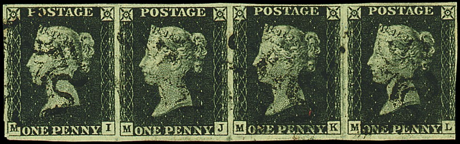 MI-ML horizontal strip of four, ML touched at lower right, otherwise good margins all round, black Maltese Cross cancellations, MI with small fault at lower left and MK torn at top; good appearance and scarce. Photo
