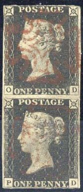 OD-PD (PD recut letter square) vertical pair, touched at top, good margins other sides, red Maltese Cross cancellations; fine