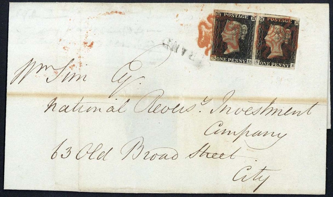 SD-SE horizontal pair, touched at right, large to very large margins other sides and showing portions of two adjoining stamps, tied by red Maltese Cross cancellations on entire dated 30 June 1840, addressed to London; filing folds clear of the adhesives, fine