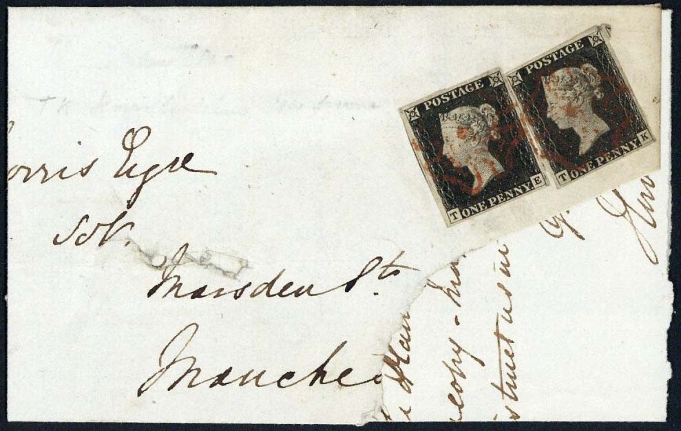 TE and TK, both with good margins all round, on part entire from Preston to Manchester, dated 29 Oct. 1840, red Maltese Cross cancellations, fine