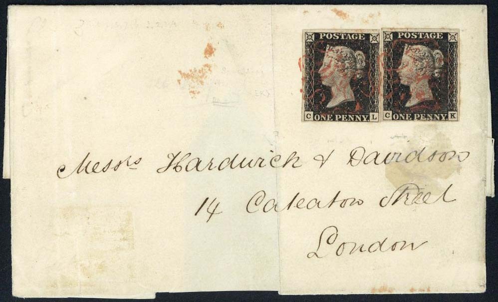 CK and CL, singles with margins all round, tied to part entire, dated 8 July 1840, from Coventry to London, by crisp red Maltese Cross cancellations, CK with small fault at foot