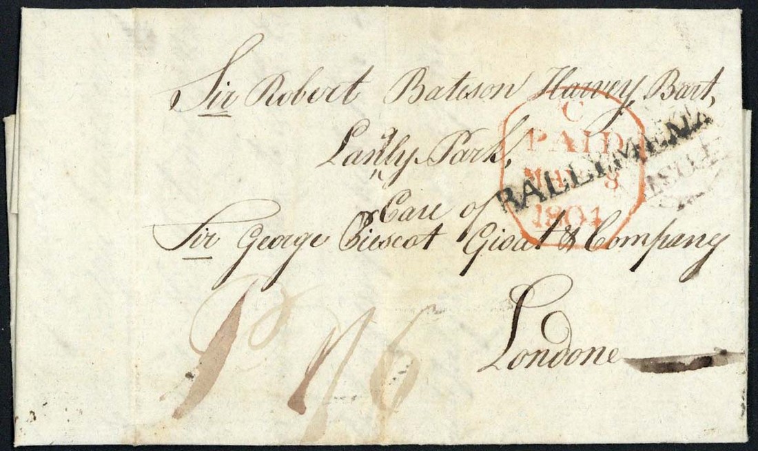1804 (8 May) entire letter to London with "ballymena" and previously unrecorded "post/paid" in circle, both overstruck by red "paid" datestamp, endorsed P 1/6 in manuscript; vertical filing folds clear of the handstamps, fine and scarce