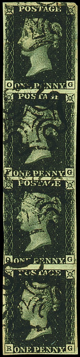 OG-RG vertical strip of four, QG just touched at left, otherwise good to large margins all round, crisp black Maltese Cross cancellations, small thins but otherwise fine and a scarce and attractive strip. Photo