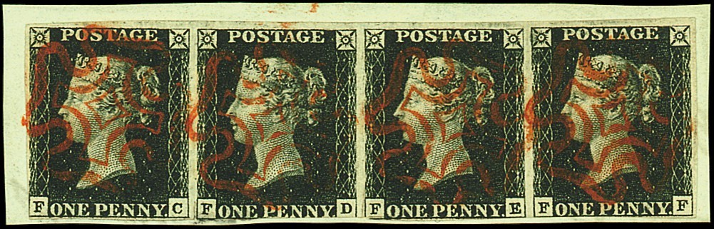 FC-FF horizontal strip of four, touched or slightly cut into at foot and touched at lower left, good to large margins other sides, tied by crisp red Maltese Cross cancellations to small piece, scarce. Photo