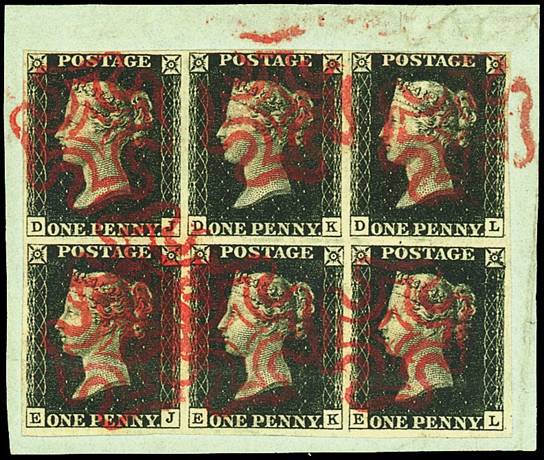 DJ-EL block of six (3x2), close to large margins all round, tied to piece by crisp red Maltese Cross cancellations, a diagonal crease affects EJ-EL but hardly affects the very fine appearance of this rare and attractive block. Photo