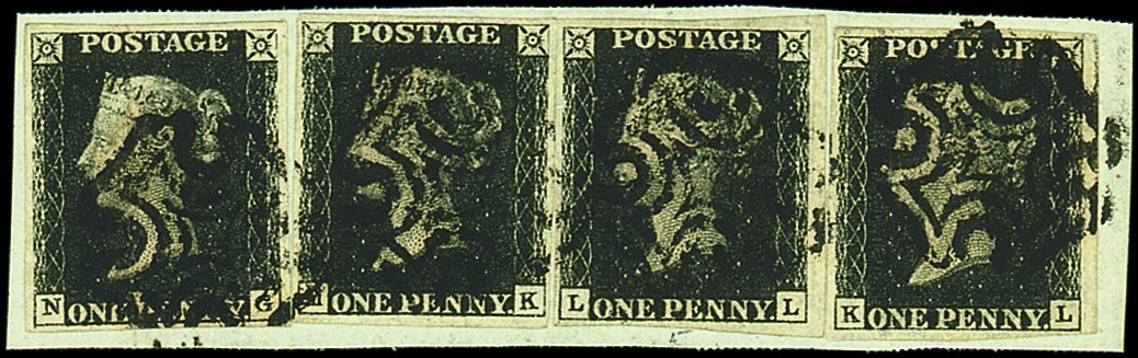 LL (re-entry), KL, MK and NG, all with margins all round, tied to piece by black Maltese Cross cancellations, NG affected by vertical filing crease, otherwise fine and attractive. Photo