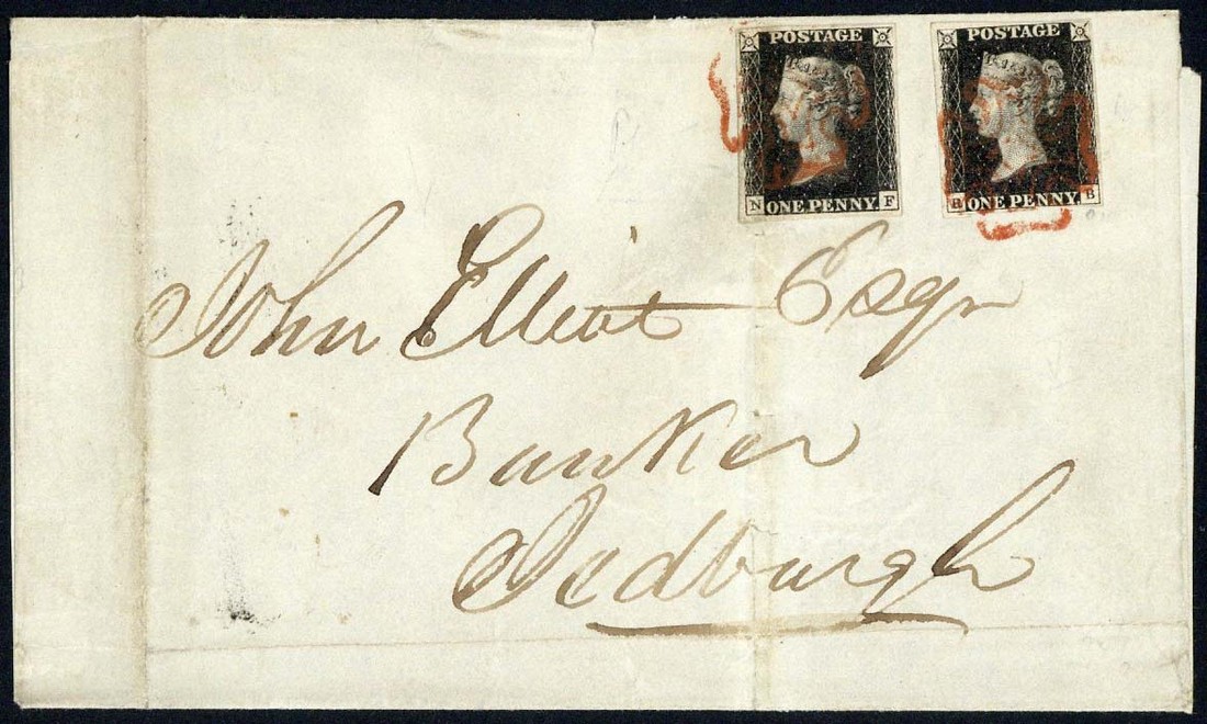 NF, margins all round, used with Plate 7 RB, a little cut into at foot, tied to entire (no side flaps), dated 19 Jan. 1841, from Hawick to Jedburgh, red Maltese Cross cancellations; filing fold affects NF, a little soiled