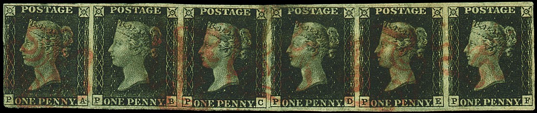 PA-PF horizontal strip of six, touched at left, good to large margins other sides, red Maltese Cross cancellations, faults but good appearance and rare. Photo