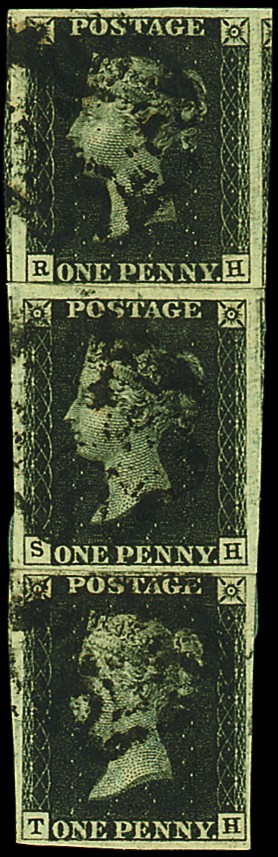 RH, SH and TH (TH double letter H) arranged as a vertical strip of three, RH touched, otherwise good to very large margins all round and showing portions of five adjoining stamps, black Maltese Cross cancellations; fine appearance and scarce. Photo