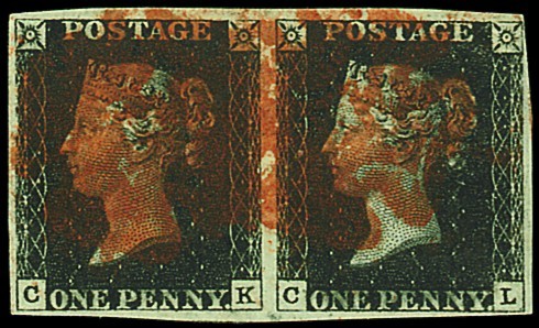CK-CL horizontal pair, close to large margins all round, slightly oily red Maltese Cross cancellations; fine. Photo