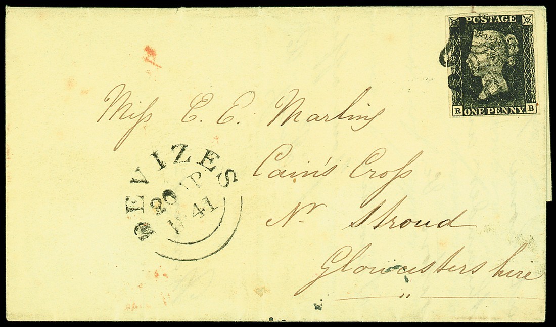 RB, an unlisted worn impression, clear to large margins all round, tied to entire letter, dated 20 April, 1841, addressed to Stroud, double ring Devises d.s. on the front; the adhesive with small inclusion in the margin by the "B" square, the entire with some wrinkles and portion of flap missing from the reverse, fine. Photo