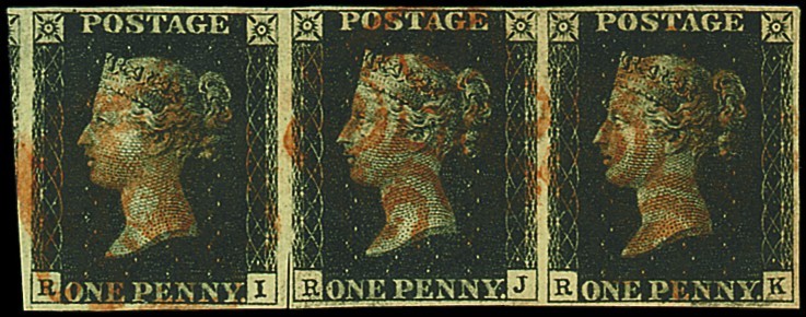 RI-RK horizontal strip of three, good to large margins all round and showing a portion of the adjoining stamp at left, red Maltese Cross cancellations; scissors cut in the margin between RI and RJ, fine. Photo