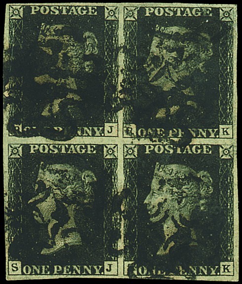 RJ-SK block of four, good to large margins all round, black Maltese Cross cancellations; RK with small thin and SJ with minute pinhole, otherwise fine and a rare block. Photo