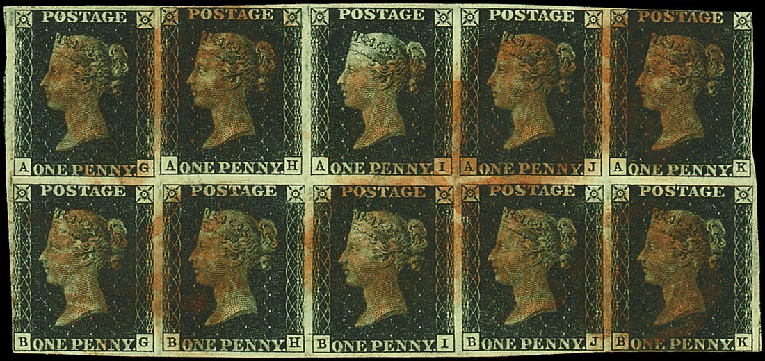 AG-BK block of ten (5x2), AK touched, otherwise close to very large margins all round and showing portions of two adjoining stamps, light and indistinct red Maltese Cross cancellations; some pressed creases or cracks, otherwise fine. A rare and impressive block. Photo