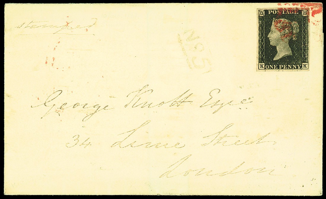 KK (re-entry), large margins, tied by red Maltese Cross cancellation, which leaves the Queen's profile clear, to entire, dated 11 Jan. 1841, from Bath to London, black boxed "No 5" alongside; vertical filing fold well clear of the adhesive, fine and most attractive. Photo