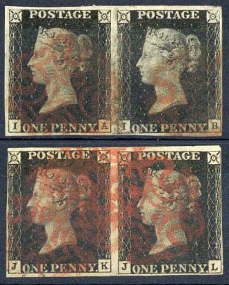 IA-IB and JK-KL horizontal pairs touched to margins all round, red Maltese Cross cancellations, tiny faults