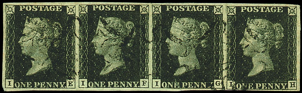 IE-IH horizontal strip of four, good to very large margins all round, crisp black Maltese Cross cancellations; IG with tear into the design at foot, some thin spots, good appearance and a scarce strip from this plate. Photo
