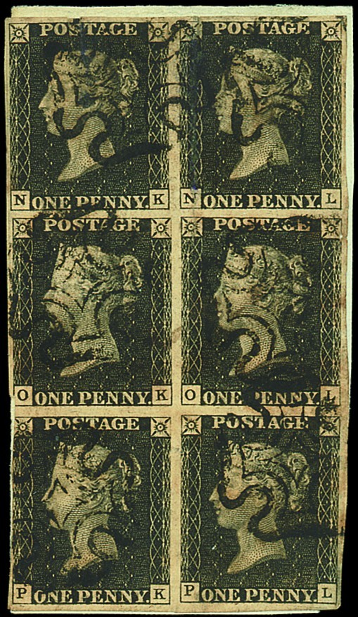 NK-PL block of six (2x3), OK and PK a little cut into, good to large margins other sides, tied by black Maltese Cross cancellations to small piece, faults and repaired but an impressive block. Photo
