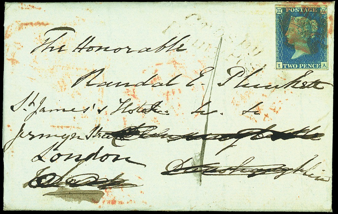 IA, close to large margins all round, tied by red Maltese Cross to entire letter, from Liverpool to Ireland, redirected to London, faint "Crosby/Penny Post" marking alongside, a variety of transit and arrival markings on reverse, fine and attractive. Photo