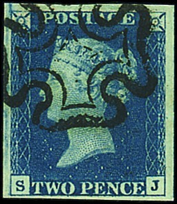 SL in a lovely deep blue shade, good to very large margins, showing a trace of the stamp to the right, a full strike of black Maltese Cross. Fresh and very fine, a stamp with great visual appeal. Photo