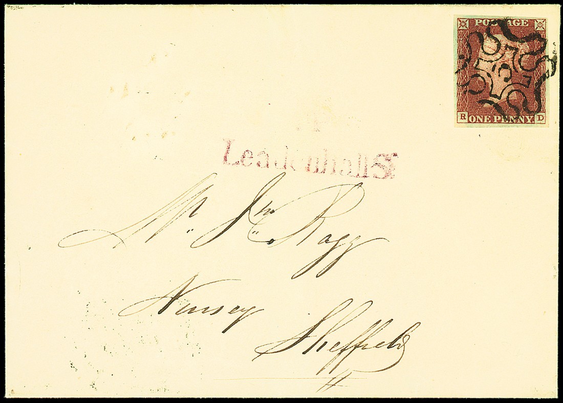 — RD, good to large margins all round, tied by a fine crisp strike of the number "5" in Maltese Cross to entire, dated 14 July 1843, addressed to Sheffield, with purple "T.P/Leadenhall St." alongside, dated markings on reverse; exceptional and uncreased. Photo