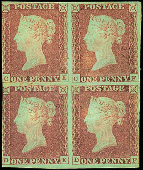 CE-DF block of four, just cut into at left, other margins close to very large, large part original gum; small thin, some creasing and wrinkling. Cat. £3,200. Photo