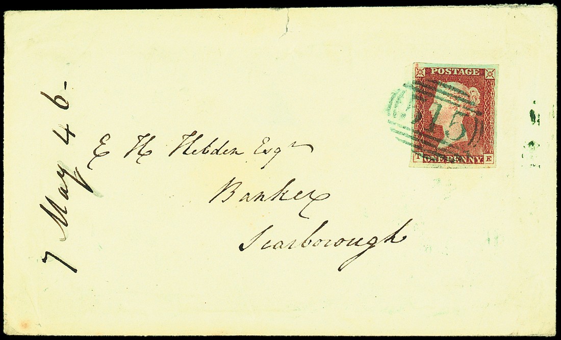 TE, large margins all round, tied to envelope by a superb blue "515" barred oval cancellation of South Cave, dated 7 May 1845, addressed to Scarborough, with matching undated "south cave" on reverse; the envelope with some minor perimeter faults but nevertheless fine and most appealing. Photo