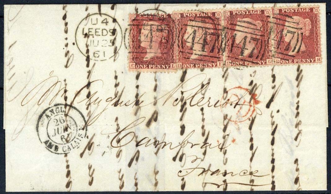 1d. Plate 56: Cl, DF-DH horizontal strip of three, tied by "447" duplex cancellations of Leeds, to entire letter dated 25 June 1851, addressed to France; transit and arrival markings, fine. S.G. 38/41