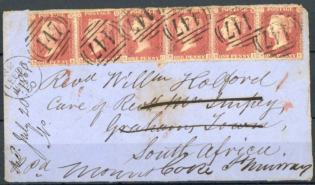 1d. Plate 56: SA-SF horizontal strip of six, tied by Leeds "447" duplex cancellations of 1 June 1860, to opened out envelope addressed to South Africa, Grahams Town arrival d.s. (19.7) on reverse; SF torn on application, otherwise fine. S.G. 38/41
