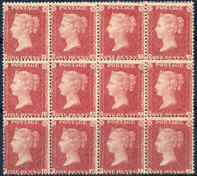 1d. rose-red, Plate 58: DG-FJ, block of twelve (4x3) with original gum, good fresh colour, some slight creases or wrinkles, fine and fresh. S.G. 40, £600 as singles