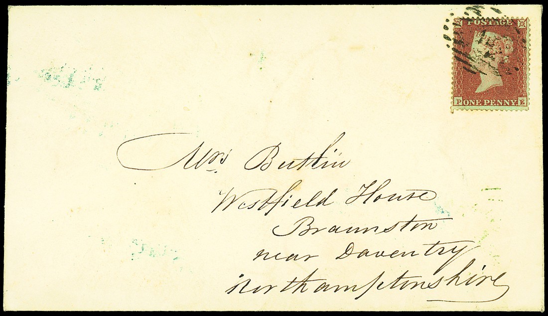1854 (25 Feb.) envelope to Daventry bearing 1d. red-brown, Plate 94: PE, well tied by London numeral cancellation, the reverse with clear despatch c.d.s., straight-line "Gt.Coram.St." in blue and part green c.d.s. An unusually fine cover. B.P.A. Certificate (1969). S.G. 16b, £2,200. Photo