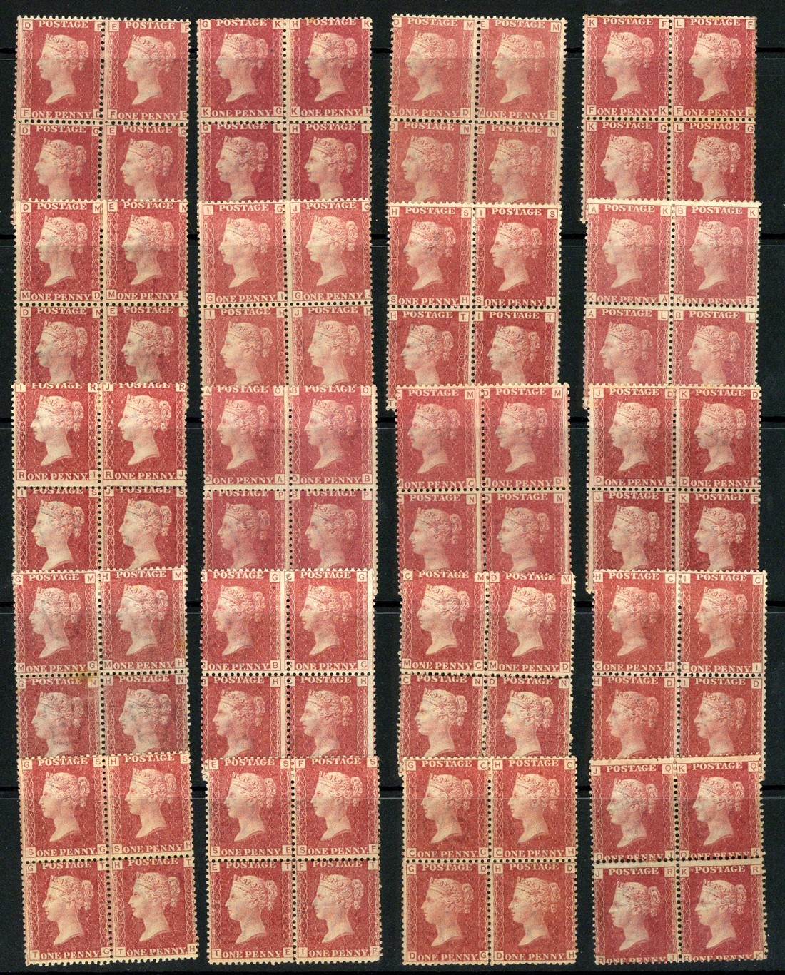 Plates 71, 73, 78, 80, 81, 87, 90, 93, 96, 98, 100, 103, 108, 111, 113, 117, 118, 120, 121, 127, 130, 134, 137, 138, 140, 147, 149, 150, 151, 156, 157, 159, 161, 167, 170, 174, 176, 181, 183, 190, 194, 195, 201, 202, 203, 204, 205, 206, 209, 210, 218, 221, 222 and 224, all in blocks of four, original gum with many unmounted; chiefly fresh. A fine lot. Cat. £13,760+