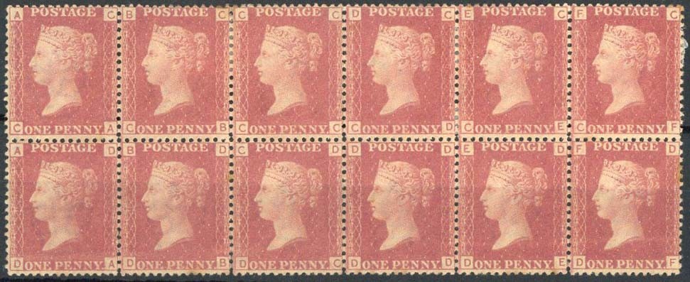 Plate 92, CA-DF block of twelve (6x2), part original gum (some hinge remainders); a few split perfs. and small stains. S.G. 43/44, £600+