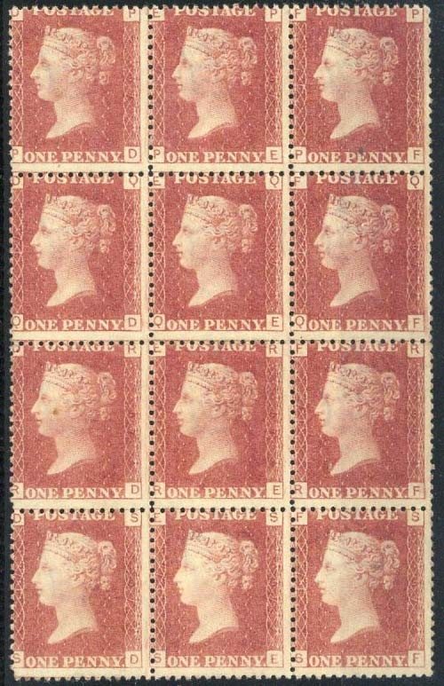 Plate 97: PD-DF, block of twelve (3x4), original gum; centred to upper left, PF with small coloured mark on the front, fine. S.G. 43/44, £660+