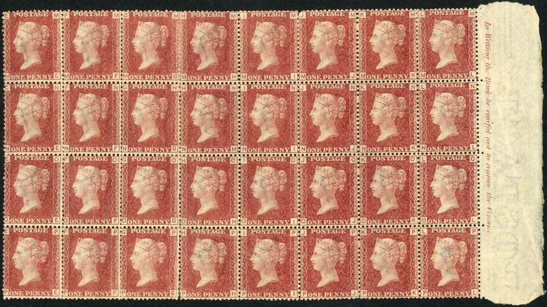 Plate 171: ME-PL block of thirty-two (8x4) from the right of the sheet with marginal inscription, original gum with many remaining unmounted mint; some split perfs. and creases. S.G. 43/44, £800