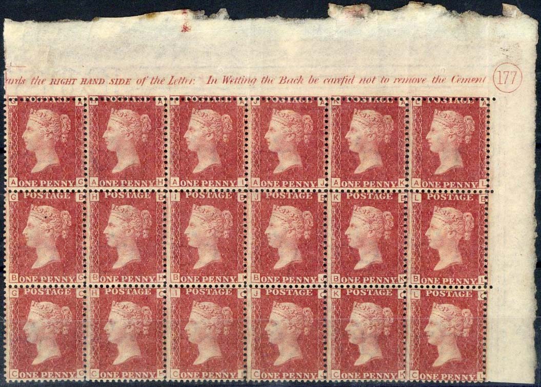 Plate 177: AG-CL block of eighteen (6x3) from the upper right corner of the sheet with inscriptions and Plate number and showing short spacing of the perforation on the "A" row; original gum (mostly unmounted), some gum wrinkles and split perfs., fine and fresh. An impressive multiple. S.G. 43/33, £990+