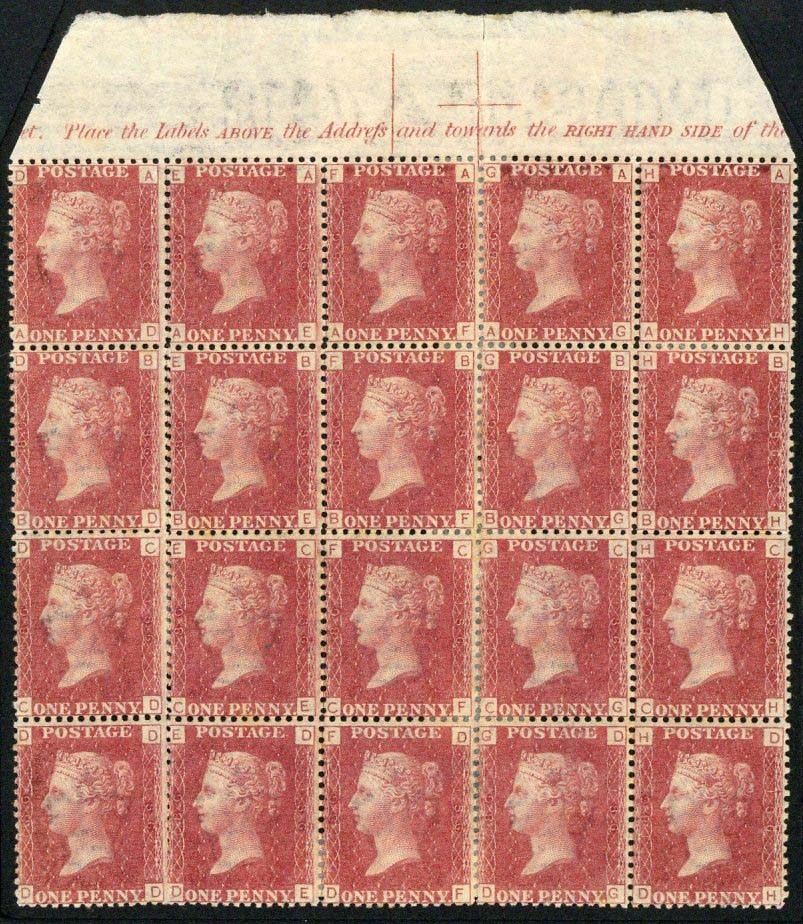 Plate 186: AD-DH block of twenty (5x4) from the top of the sheet with marginal inscription, part original gum, split perfs. strengthened by hinges, fine. S.G. 43/44, £1,700