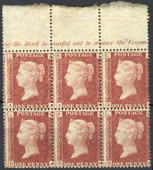 Plate 194: AJ-BL block of six (3x2) from the top of the sheet with inscription, unmounted mint, centred to right and the usual gum wrinkles, fine and fresh. S.G. 43/44, £390+