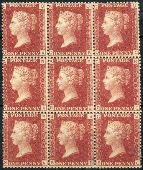 Plate 199: QA-SC block of nine (3x3), original gum; usual gum wrinkles, centred a little to left, fine. S.G. 43/44, £630+