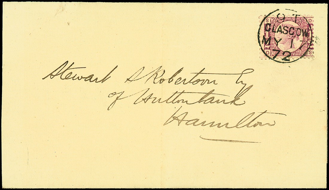 Plate 9: DS, tied by Glasgow c.d.s. of 17 May 1872 to printed matter, addressed to Hamilton; light and unobtrusive vertical filing fold, well clear of the adhesive, fine; fresh colour and a marvellous cover of outstanding quality and rarity for the scarcest Plate in this condition. S.G. 48/49. Photo