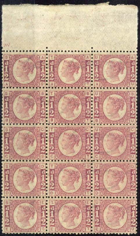 Plate 13: AS-EU block of fifteen (3x5) from the top of the sheet, unmounted mint, hinged in the margin; fine. S.G. 48/49, £1,800+