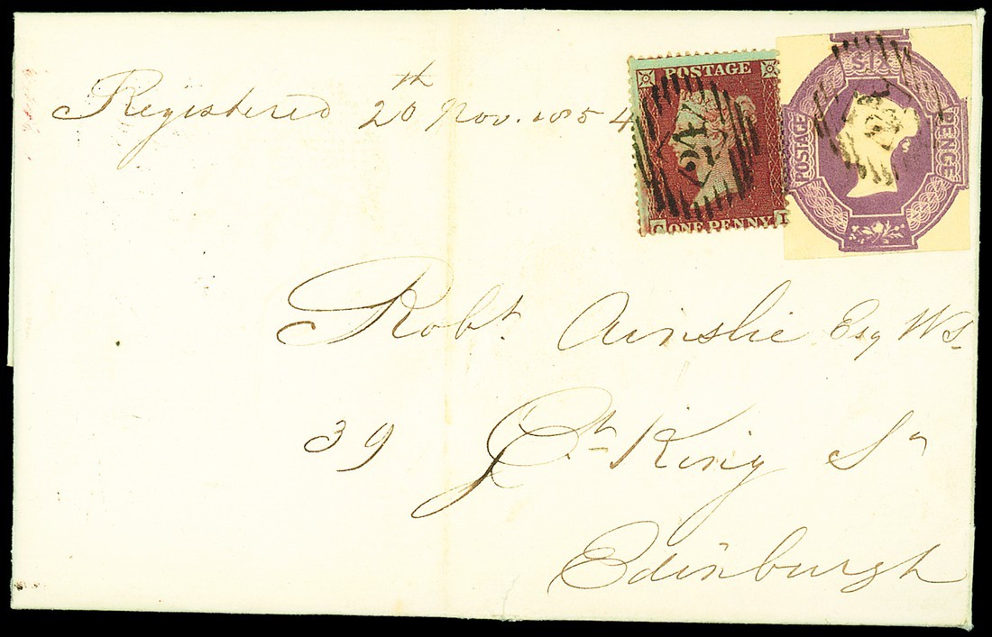 6d. mauve, a beautiful shade, cut square and with clear to huge margins all round, used with watermark small Crown, perf. 16 1d. on entire letter, dated 20 Nov. 1854, registered to Edinburgh, London Inland "24" barred oval cancellations and with Lombard St. Maltese Cross datestamp on reverse; light vertical filing fold well clear of the adhesives, fine. S.G. 17, 58. Photo