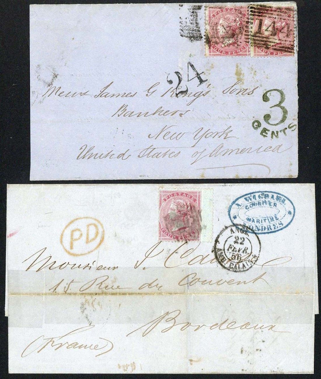 4d. carmine (2) tied by "144" cancellations of Forfar to entire letter (no side flaps), dated 12 Nov. 1855, addressed to New York, "24" and "3/cents" handstamps, fine. Also 4d. (wing margin) tied by London duplex cancellation on entire, dated 21 Feb. 1856 addressed to Bordeaux with blue oval A.Wigdahl forwarding Agents marking (unrecorded by Lowe); some faults. S.G. 62