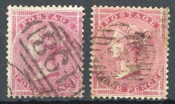 4d. carmine, two used examples, good colour; a few short perfs., fair to good. S.G. 62a, £850