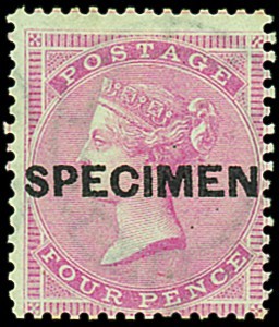 4d. carmine, white paper, specially prepared ink, overprinted "specimen" type 4, large part original gum, centred to lower right, fresh colour and fine. S.G. 65s, £1,800. Photo