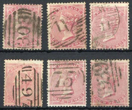 4d. carmine, six used shades, two with inverted watermark, a few faults. S.G. 66, 66aWi, £1,200